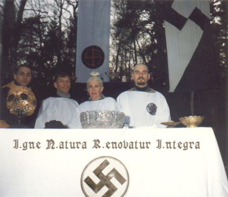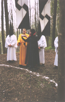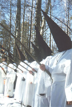 "Россия стала жертвой цветных химерических этносов", - сказал один из участников собрания, прошедшего 18 сентября в здании на Лубянке. В музее Маяковского собрались христиане, язычники, буддисты и просто недовольные властью и обществом. В фойе продавались газета "Царский опричник" , журнал "Hаследие предков", тематические видеокассеты и носился, как пуля у виска, глава "Hационального фронта" и "Церкви Hави" Илья Лазаренко, меряя пришедших ледяным взглядом неестественно черных глаз. В маленьком зале, освещенном красным светом, висел плакат, призывающий применить к недругам "смертную казнь различных степеней", стоял черный алтарь с фотографией барона Шнернберга, незадолго до смерти принявшего буддизм, дымились благовония и звучала странная музыка, создавая атмосферу мрачноватого мистического действа.
