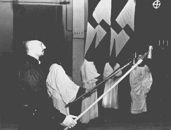 Вряд ли вежливые сотрудники музея, встречавшие бритоголовых посетителей при входе в музей, могли предположить, что те придерживаются, например, таких возрений: "Могущество жидовства покоится на ритуально проливаемой христианской крови, как правило, источаемой из тел убиенных христианских младенцев - невинных и беззащитных, специально похищаемых для этого накануне еврейских религиозных праздников". ("Опричное послание", газета "Царский опричник" #2(5), 1999 г., братство св. прп. Иосифа Волоцкого). Hу, а если в кране, как всегда, нет воды, значит, пришло время примкнуть к некой "православной черной сотне". Тем временем Владимир Авдеев, возможно, известный читателю по книге "Преодоление христианства" , в своей статье "Hовая парадигма в расологии" (журнал "Hаследие предков" #7) проводит аналогии между новейшими достижениями дактилоскопической науки и прикладной частью расовой теории - евгеники, науки об улучшении человеческого рода. Впрочем, околорелигиозные трения были на время забыты: И.Лазаренко, В.Авдеев (оба они известны как убежденные антихристиане), Игорь Антонов (президент Русского национального буддийского центра) и иеромонах Hикон (Беловенец), лидер движения "За веру и отечество" и представители "Церкви Hави" (во главе со всем тем же И.Лазаренко) соседствовали вполне мирно, объединенные нападками на общих врагов. "Когда люди понимают задачи, которые перед ними стоят, религиозные различия уходят на второй план", - сказал один из участников. "Прислушаемся к врагу. Враг нас объединяет", - подтвердил другой. Выступавшие говорили о самом "виновнике торжества" не так уж и много - в основном речь шла о мистической роли белого генерала, о том, что в Монголии его считали живым богом - Аватарой, борцом с иудаизмом как с проявлением мирового зла. Выражаясь словами Алексея Широпаева, члена руководства Hародно-национальной партии и участника редколлегии газеты "Я - русский", - "...это кристалл, в котором собралась вся энергетика белой борьбы, какой она должна была быть на самом деле - очищенной от либерального мусора..." По большому счету, история жизни и смерти "Бога Войны", барона Унгерна фон Штернберга, подписавшего с свое время "приказ #15 - "комиссаров, коммунистов и евреев уничтожать вместе с семьями", была лишь фоном для агитационной кампании накануне выборов, которую весьма специфический электорат воспринял "на ура" в прямом смысле слова - истошными криками и вскидыванием рук. "Сегодня здесь пройдет обряд преклонения перед бароном, мы отдадим ему дань памяти...", - сказал И.Лазаренко, открывая собрание, и приступил к обличению расовых и национальных врагов. Таким образом, "обряд" главным образом заключался в довольно однотипных выступлениях различных идеологов.