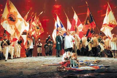 Мариинский, надо полагать, тоже остался доволен, приняв внимание глав государств как заслуженную награду за десятилетнюю бурную деятельность, в ходе которой театр поставил практически все оперы Прокофьева. "Война и мир", пожалуй, самая великая из них, но и самая сложная для сценического воплощения. Разнородные эпизоды - от классических арий и танцев до киномузыки и полуразговорных диалогов - спаяны в единое целое. Страшные звуковые "картины" сражений - взрывы, стоны раненых - сосуществуют с трогательными лирическими темами, колоритными жанровыми сценами, величественными гимнами. Музыка "Войны и мира" требует столь же гибкого и богатого театрального языка, соединяющего сценические технологии ХХ века с классическими режиссерскими приемами прошлых эпох. Но наша современная оперная режиссура пока что такого языка не знает.
