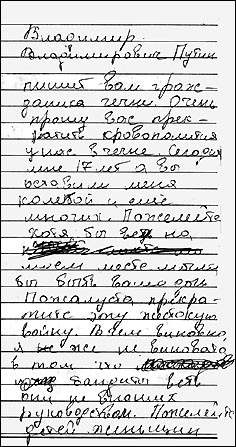 «Владимир Владимирович Путин! Пишет вам гражданка Чечни. Очень прошу вас остановить кровопролитие. Сегодня мне только 17 лет, а вы уже оставили меня калекой. И еще очень многих. Пожалейте хотя бы: ведь на моем месте могла бы быть ваша дочь. Я же не виновата в том, что есть бандиты. Подумайте над моим письмом. Зура».