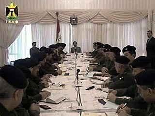 Сегодня иракское телевидение распространило кадры закрытого совещания правительства страны, на котором присутствовал президент Ирака Саддам Хусейн.