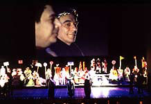 Интендант Баварской оперы Петер Йонас, наоборот, ратует за максимальное единообразие - каждой опере отведено место звена в общей цепи. Виражи - от отработанной классики к суперсовременности. При различии режиссерских "почерков" огромная сцена всегда оформлена очень лаконично (актуальный минимализм), декорации выдерживаются в одной цветовой гамме, певцам предоставляется максимальная свобода передвижений, и подчас в этом огромном пустом пространстве они кажутся затерянными путниками в пустыне. Вместе с тем баварцы предпочитают эффектно воздействовать на воображение зрителя огромными конструкциями - передвижной стеной и гигантскими часами ("Пиковая дама"), яркой неоновой рекламой ("Ринальдо"), киноэкраном ("Милосердие Тита"), жутких размеров люстрой ("Травиата"). Декорации играют роль символов, певцы - толкователей этих символов. При таком жестком регламенте не каждый способен сохранить свое "лицо". "Травиата" Гюнтера Крамера, несмотря на сильный состав певцов (во главе с Дмитрием Хворостовским и Еленой Келессиди), выглядит безлико и нудно - совершенно непонятно, зачем было переносить действие из парижского полусвета прошлого столетия в меблированные апартаменты века нынешнего. В памяти живет легендарный, сказочный по красоте фильм Франко Дзефирелли и циничный, насквозь пропитанный гротеском спектакль Питера Холла с Глайднборнского фестиваля - и черно-белая история Кремера кажется рядом с ними бедной родственницей. Примерно такая же ситуация с моцартовским "Милосердием Тита". Идея режиссера Мартина Данкана - показать все перипетии крупным планом с помощью кинокамеры и большого экрана, показать зрителю, "как делается опера" - удачна. Но замысел не выдерживает испытания сценическим временем. Постепенно экран, с его выразительными стоп-кадрами и открытыми ртами вокалистов, надоедает и начинает мешать. Сценическое же действие как таковое не выстроено - все внимание режиссера поглощено киноэффектами и ко второму действию спектакль стремительно снижает темп, в то время как, по логике, вещей, должно происходить наоборот. Подчинить театральный спектакль законам видео-клипа не удалось.