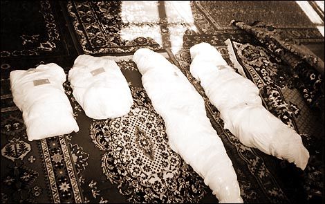 — многодетной матери Зайнап Джаватхановой, № 38-38, подписанное судмедэкспертом Кахабером Теховым: «ПРИЧИНА СМЕРТИ: а) не установлена; б) обугливание тела». (Означает — полностью сгорела.)