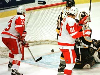 Воодушевленный примером своего соотечественника Игоря Ларионова, центрфорвард "Детройта" Серей Федоров набрал четыре очка в гостевом матче регулярного чемпионата НХЛ против "Рейнджерс". По ходу матча Сергей отдал три голевые передачи, а в кульминационный момент встречи на последней минуте при счете 3:4 забил решающую шайбу в оставленные голкипером ворота. Он стал не только главным и наиболее результативным героем минувшего игрового дня, но и формально обеспечил лидеру регулярного чемпионата законное место в плей-офф. Пятый гол "Рэд Уингз" стал для Федорова 25-м в сезоне.
