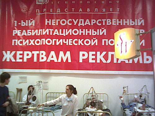 На "Дизайн и рекламу" меня тоже не приглашали. Икра так и осталась неразобранной. Ну, думаю, зайду по дороге. Однако был ошарашен. Такого не видел никогда. Совершенно классная, шибающая по нервам, мозгам, зрению выставка. Встречает, скажем, у входа милиционер с жезлом, дает правила движения по выставке, если идти правильно, то придешь куда-то, где за полцены дадут годовой комплект чего-то. Я только жезл его потрогал. "Настоящий?" - спрашиваю. - "А то як же!" А про капитанские погоны спросить постеснялся. Поскольку, сделав два шага влево, оказался в больничной палате. Четыре кровати с загипсованными и перебинтованными людьми, медсестра. Надо всем этим плакаты о пострадавших от рекламы. Видя мой открытый рот, мне тут же дали медицинскую карту и проштемпелевали направление на психологическую реабилитацию. Потом оказался в настоящем тире, где желающие стреляли в рекламное яблочко. Елки-палки! Рот у меня не закрывался до самого конца. Девушки совали рекламные проспекты, календари, майки, кепки, пакеты. Весь этот современный покатый дизайн ярчайших расцветок всасывал в себя, выбрасывая меня в виде постера, календаря и дурно улыбающейся физиономии на собственном логотипе. Ну, думаю... Жаль, что все это кончилось в субботу, и я могу только тебя пригласить на следующий год.
