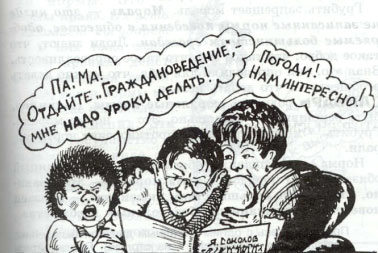 П еред вами едва ли не самая правдоподобная - при кажущейся нескромности - картинка из учебника "Граждановедение" для 5-го класса. Если присмотреться, можно разглядеть и фамилию автора - Соколов. Картинка эта потому правдоподобна, что учебник Соколова действительно вызывает у взрослых людей неподдельный интерес и здоровый смех. Очень уж много в этой книге странностей и необычностей.
