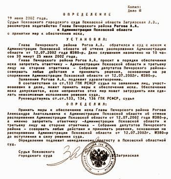 Она признала Собрание депутатов Печорского района третьим лицом в процессе (на стороне администрации области) и одновременно запретила до вступления в силу решения суда применять на практике два распоряжения областной администрации, которыми и были зарегистрированы скандальные изменения в Уставе Печорского района – после того, как их отказалось зарегистрировать областное управление Министерства юстиции.