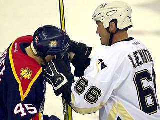 С Лемье 'Пантеры' в этом матче особо не церемонились, сообщает nhl.ru. Охота за многострадальным ветераном началась с первых минут. Супер-Марио дважды в течение одной смены попадал под силовые приемы защитника Эрика Бодуана. В конце второго периода Брэд Ференс у синей линии начал Лемье 'жалить' клюшкой - за босса вступился Иан Моран. Эмоции выплеснулись наружу в середине третьего периода. Нахала Ференса решил образумить штатный вышибала 'Пингвинов' Стив Маккенна, на которого с кулаками тут же налетел Питер Уоррелл. Не остался в стороне Джейми Пушор, нашедший себе спарринг-партнера в лице Бодуана. Пока Пушор возился с Бодуаном, товарищу на помощь пришел голкипер Роберт Люонго. Наглеца обозленный оборонец 'Пингвинов' уложил на лед с первого удара. Следующим на авансцену вышел Себастьен Карон, устремившийся добивать своего коллегу по амплуа. В итоге арбитры выписали 77 минут штрафа, удалив Маккенну и Уоррелла до конца игры.