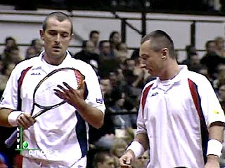 Сборная России по теннису повела в счете 2-1 в матче Кубка Дэвиса против сборной Чехии. В субботу Евгений Кафельников и Михаил Южный выиграли парную встречу у Мартина Дамма и Сирила Сука. Поединок, продолжавшийся 2 часа и 44 минуты, завершился со счетом 7:6 (7:1), 4:6, 6:3, 6:3 в пользу россиян. Стоит отметить, что сборной России в соревнованиях Кубка Дэвиса с апреля прошлого года не удавалось выиграть парную встречу.