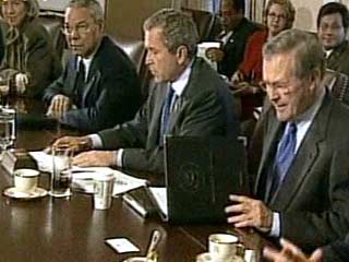 В субботу в своей загородной резиденции в Кемп-Дэвиде, штат Мэриленд, Буш провел совещание с участием директора ЦРУ Джорджа Тенета, советника президента по национальной безопасности Кондолизы Райс и главы сотрудников аппарата Белого дома Эндрю Карда. При этом в режиме видеоконференции по закрытым каналам связи в совещании приняли участие вице-президент США Ричард Чейни, госсекретарь Колин Пауэлл и его первый заместитель Ричард Армитидж, министр обороны Дональд Рамсфельд и его первый заместитель Пол Вулфовиц, а также председатель объединенного комитета начальников штабов Вооруженных сил генерал Ричард Маерс и его заместитель генерал Питер Пейс.