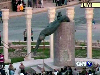 Вначале иракцы пытались кувалдами разбить постамент, на котором стоит 6-метровая статуя Саддама. Но их действия успехом не увенчались. От мраморного постамента откалывались лишь мелкие осколки. Тогда на постамент взобрались несколько человек с веревкой.
