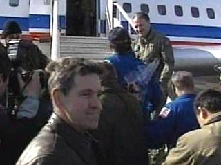 Встречают прилетевших из Астаны россиянина Николая Бударина и американцев Кеннета Бауэрсокса и Дональда Петтита главы Росавиакосмоса и NASA Юрий Коптев и Шон О'Киф, друзья и родственники космонавтов.