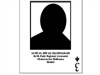 Согласно заявлению СЕНТКОМ, в субботу задержаны Саиф аль-Дин аль-Машхадани, (в колоде 55-ти тройка треф), бывший региональный глава Баас в провинции Мутанна, и Сад Абд аль-Маджид аль-Фейсал, возглавлявший отделение правящей партии в провинции Салах-эд-Дин, сообщает РИА 'Новости'.
