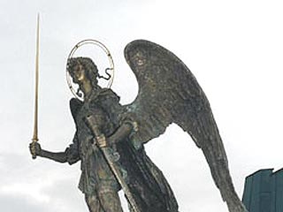 На нем изображен святой воитель архистратиг Михаил - небесный покровитель города и области - с огненным мечом, попирающий ногами дьявола.