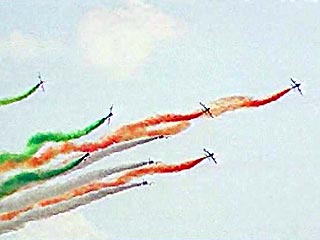 Итальянцы из Frecce Tricolori и французская группа La Patrouille de France исполнили в небе над Жуковским летную фигуру высшего пилотажа. Огромное сердце с самой низкой точкой 100 м и самой высокой 1800 м было исполнено летчиками на легких истребителях со скоростью до 600 км/час.