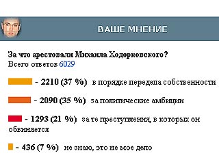 Портал Mail.ru, а также информационные ресурсы Lenta.ru, Gazeta.ru, Ytro.ru, NEWSru.com и Vazhno.ru организовали в интернете голосование, посвященное возможной причине ареста Михаила Ходорковского.