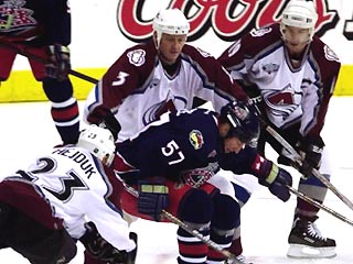Минувшей ночью в НХЛ состоялись шесть матчей регулярного чемпионата. Центральной встречей можно назвать противостояние в Денвере, где один из главных фаворитов сезона "Колорадо" принимал действующего обладателя Кубка Стэнли "Нью-Джерси". Игра закончилась вничью - 1:1, причем обе шайбы были заброшены во втором периоде с минутным интервалом, сообщает РИА "Ореанда". Хозяева открыли счет после того, как Милан Хейдук в одно касание переправил шайбу в ворота Мартина Бродера. А за "дьяволов" отличился Эрик Расмуссен: голкипер "Колорадо" Дэвид Эбишер сумел задеть шайбу щитком, но она все же пересекла линию ворот. Расмуссен набрал первое очко в чемпионате 2003-2004 годов, а гол стал для него первым с 5 февраля.