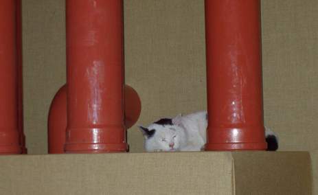 Лично же мне понравился совершенно непреднамеренный дизайнерский эффект у входа на выставку. На верхней площадке парадной лестницы, где располагаются щиты с названием и титульной информацией, сооружены выходящие из напольного пандуса симпатичные бутафорские оранжевые трубы. Их облюбовал местный кот - наглого вида, лобастый, грязноватый. Укладывается под ними в живописной позе и спит. Чем оживляет пейзаж. И подтверждает общее впечатление, что выставка не про нефть, а именно про жизнь вокруг нефти.