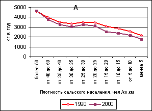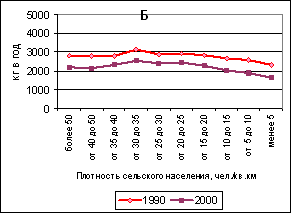Рисунок 6. Надои молока на одну корову в зерновых в нечерноземных (А) и южных (Б) районах Европейской России с разной плотностью сельского населения, 1990 и 2000