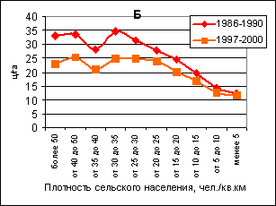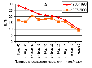 Рисунок 5. Урожайность зерновых в нечерноземных (А) и южных (Б) районах Европейской России с разной плотностью сельского населения, 1986—1990 и 1997—2000 годах