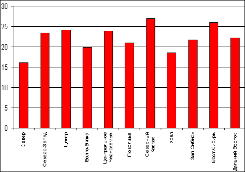 Из рисунка 3 видно, что доля такого населения максимальна на юге, где слаба обустроенность городов, но крупнее и лучше благоустроены села. Недалеко ушли от него Восточная Сибирь, Северо-Западная и Центральная Россия с множеством полусельских городов. Но лидируют все-таки автономные округа (в Ненецком, Корякском, Эвенкийском АО в таких условиях проживает более 40% населения) и кавказские республики. А среди русских регионов полугородскими-полусельскими в наибольшей степени (30% населения и сверх того) являются Ставрополье и Краснодарский край, Брянская и Ивановская области.