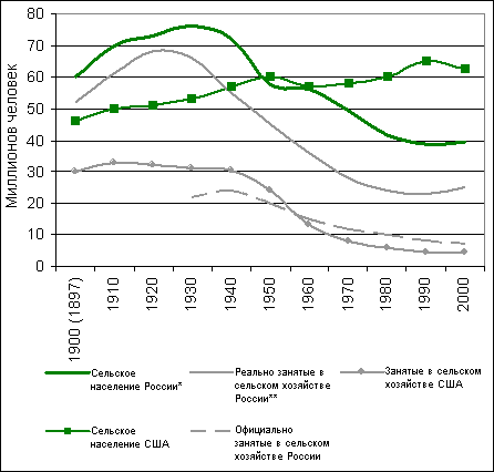 Рис. 1 показывает, как менялось в ХХ веке соотношение численности сельских жителей и занятых в сельском хозяйстве в России и Америке.