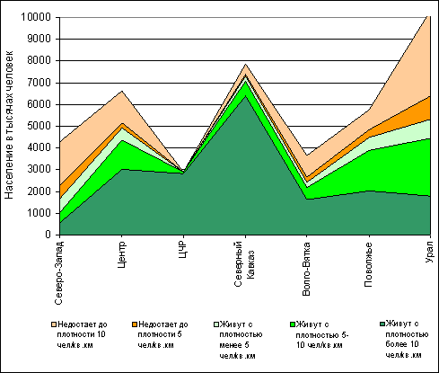 Рис. 7 показывает, что относительно благополучную ситуацию с заселенностью Европейская Россия имеет только в Центрально-Черноземном районе. Там нет территорий с плотностью менее 5 человек на кв. км и для обеспечения на всей территории необходимой плотности в 10 человек на кв. км "нужно" всего около 5 тысяч жителей. Поскольку здесь использовались данные за 2000 год, а поток миграций в этот район все еще высок, то эти 5 тысяч наверняка уже восполнены. Даже на Северном Кавказе, в основном в Ростовской области и в горных районах, есть недонаселенные по выбранному критерию районы. Но здесь и максимально число людей (около 6,5 миллиона), живущих в средне- и плотнозаселенных районах.