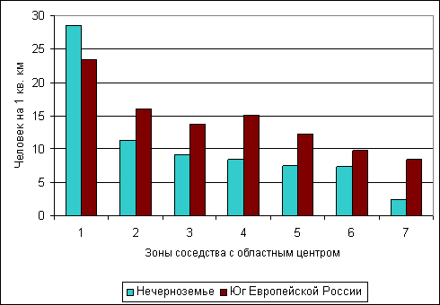 Рисунок 4. Плотность сельского населения по зонам соседства с областными центрами в северной и южной частях Европейской России