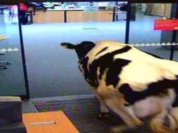 Накануне для работников сберкассы в местечке Вуншторф недалеко от немецкого города Ганновер выдался необычный день. В полдень автоматические двери заведения открылись, и в помещение вошла пестрая корова. Животное не спеша прошагало по банку, протиснулось между двумя служащими, немного постояло, громко чавкнуло и затем отправилось дальше по своим делам, пишет сегодня об этом случае газета Bild, статью которой публикует Inopressa.