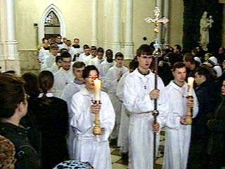 Около полутора тысяч человек собралось в Великую Субботу вечером в московском католическом кафедральном соборе Непорочного Зачатия Пресвятой Девы Марии на праздничное пасхальное богослужение, которое возглавляет глава российских католиков архиепископ Тадеуш Кондрусевич.