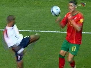 Казалось, англичане выстоят. Настолько они были уверены в собственной непробиваемости. Но за семь минут до конца основного времени матча усилия Сколари, выбросившего к тому времени на зеленое сукно столичного стадиона "Да Луш" все свои козыри, оправдались. Вроде бы неоправданно заменивший Фигу молодой нападающий "Тоттенхэма" Элдер Поштига в высоком прыжке головой замыкает навес Симау с левого фланга - 1:1.