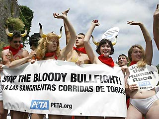 Пробежав по тому же маршруту, по которому быков гонят на арену для корриды, они надели на себя "минимум одежды", чтобы привлечь внимание к своим требованиям прекратить мучения ни в чем не повинных животных.