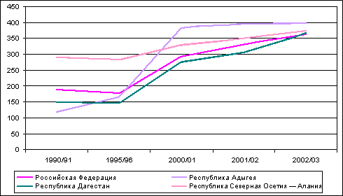 Рисунок 8. Число студентов вузов на 10 тысяч населения. Россия и некоторые российские регионыВ этих республиках вузы все больше выполняют роль «сейфов», куда молодежь «сдается» на 5-6 лет, поскольку иного применения ей в этих регионах трудно подыскать. Тем самым несколько уменьшается социальная напряженность, сдерживается и молодежная безработица, которая в указанных субъектах Федерации могла бы породить крайне опасные процессы. Однако необходимо учитывать, что «сейфовая» функция высшего образования отнюдь не беспредельна, а отложенные проблемы рано или поздно придется решать.