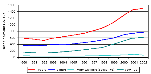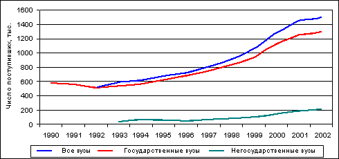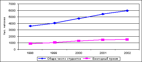 За последние 5 лет (1998-2002 [1] годы) контингенты вузов почти удвоились, а прием за тот же период вырос в 1,5 раза (рис. 1):