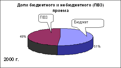 Рост числа вузов и числа студентов в государственных вузах происходил в основном за счет расширения платного обучения, тогда как число бесплатных, бюджетных мест почти не менялось. Это привело к тому, что в 2000 году сравнялось число тех, кого вузы приняли на 1-й курс на бюджетные места (то есть бесплатно), и тех, кто поступил в вузы на платной основе, то есть на основе полного возмещения затрат на обучение (ПВЗ) — рис. 4: