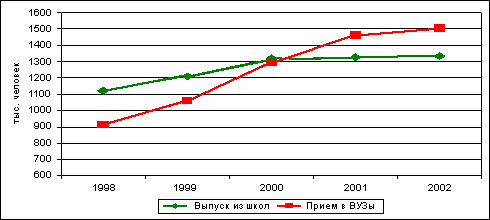 Рисунок 2. Выпуск из средних школ и прием вузыВ 2002 году прием в вузы уже на 200 тысяч человек превосходил выпуски из школ. Наряду с приемом на очное отделение рос и прием и на заочное, который в 2002 году достиг 40% от общего приема. Эти тенденции сохранились и в 2003-2004 годах.