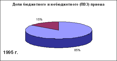 Рисунок 5. Соотношение бюджетного и небюджетного приема в российские вузы в 1995 и 2000 годахВ 2003/2004 учебном году доля первокурсников, обучающихся на платной основе в государственных и негосударственных вузах России, достигла 57%. В общей численности студентов государственных вузов удельный вес платного контингента превысил 45%. В результате, если учитывать государственный и негосударственный сектор высшего образования, то доля тех, кто обучается в вузах России на платной основе, перевалила за 51%.