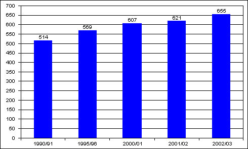 Рисунок 6. Число поступивших в государственные и негосударственные вузы. 1990-2002В 2002 году в России было 369 студентов государственных вузов на 10000 человек населения. На бюджетной основе училось уже 219 человек против законодательно установленной нормы в 170 студентов госвузов на 10000 человек населения. При этом бюджетное финансирование в расчете на 1 студента-бюджетника не превышает даже на дневном отделении 22 тысячи рублей, или 750 долларов США в год. Если говорить о рациональной потребности в средствах, то бюджетные ассигнования, несмотря на быстрый рост государственных расходов на образование в последние годы, покрывают примерно 25%. Но при дефиците ресурсов идет увеличение числа государственных вузов (рис. 7).