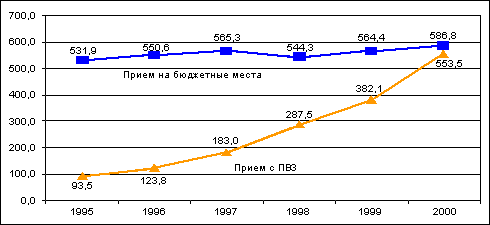 Рисунок 4. Прием в вузы на бюджетной и платной основе. 1995-2000