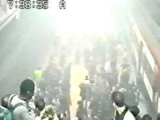 Взрыв зафиксировала камера наблюдения, находящаяся на верхнем уровне здания станции Atocha. Видно, как сразу после взрывов начинается паника и пассажиры бегут на верхний уровень по эскалаторам.
