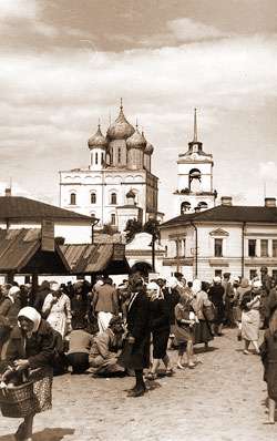 Стихийно возникший рынок помог городу во время оккупации избежать голода. На базар приезжали крестьяне окрестных деревень, эстонцы и латыши из приграничных хуторов. Они привозили мясо, молоко, мешки с мукой, картофель, мед. Чтобы купить продукты, горожанам приходилось выносить на продажу все, что у них было накоплено до войны. Вскоре немцы до основания разобрали коробку Гостиного двора (осталась только коробка здания старого Городского Магистрата), и здесь возникла барахолка. Кроме вещей, здесь продавали глиняную посуду, скобяные изделия, плетеные корзинки. По периметру площади коммерсанты открыли ларьки.