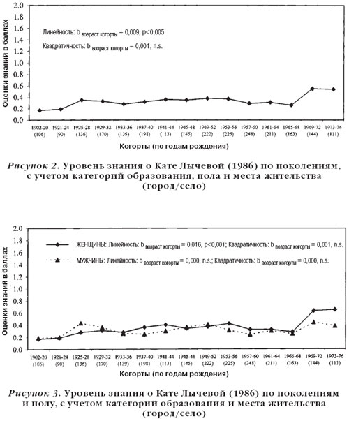В 1994 году мы обнаружили, что уровень знаний о Кате Лычевой у русских примерно такой же, как о реформаторском движении 1968 года в Чехословакии (сравните данные о Кате Лычевой и «Пражской весне» в табл. 1). Но как видно из рис. 2, знания о Лычевой сконцентрированы в самых молодых когортах, среди тех, кому в 1986 году, когда она стала известной, было от 10 до 17. Кроме того, уровень знаний по восьми из девяти событий, представленных в табл. 2, у мужчин оказался значительно выше, чем у женщин, тогда как в отношении Кати Лычевой женщины демонстрируют бoльшую осведомленность. Еще более важно, что это гендерное различие почти целиком приходится на две самые молодые когорты, для которых оно является значимым (P < 0,02) и определяет проявление эффекта исторического периода, представленное на рис. 3. Взаимосвязь, проявляющаяся на рис. 2, для мужчин полностью отсутствует (ни линейные, ни квадратичные эффекты для мужчин не обеспечивают значимости, несмотря на явное небольшое повышение для молодых людей), но линейная зависимость для женщин очень существенна, и дополнительный член-произведение для общей связи когорта/пол тоже довольно значителен (P < 0,03).