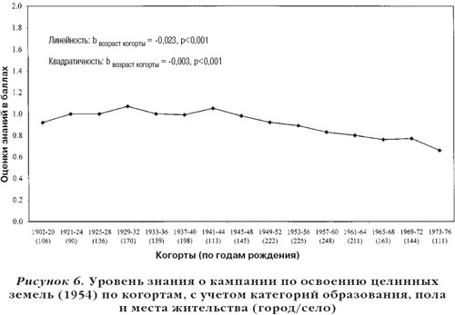 Чтобы привязать более конкретное знание к определенным пунктам в рамках почти трех десятилетий, на протяжении которых к этой кампании привлекалось общественное внимание, мы закодировали правильные и частично правильные ответы с упоминаниями о двух советских лидерах, имена которых были связаны с ней в разные периоды. В 1994 году средний возраст в группе из 170 респондентов, которые упоминали только о роли Хрущева, составлял 50 лет, значит, в 1954 году, когда эта кампания началась, им было в среднем по 10 лет, и развитие этой кампании совпало с их юностью. Средний возраст группы из 142 респондентов, которые упоминали только о роли Брежнева, составлял 39 лет, т. е. к моменту начала правления Брежнева им было в среднем по 10 лет, и по времени начало их взрослой жизни совпало с периодом широкой пропаганды его книги (что касается разницы средних значений, t = 6,3; df = 305; P <0,001). Обоих лидеров упомянули только восемь респондентов, и их средний возраст в 1994 году, как и следовало ожидать, оказался промежуточным — 45 лет. Таким образом, хотя при рассмотрении всей совокупности оценок для кампании по освоению целинных земель неравномерность распределения знания по когортам получается небольшой, важный элемент этого знания может быть более четко привязан к личному опыту, приобретенному в юные годы. Хотя это можно рассматривать как эффект когорты, важно понимать, что она была ориентирована прежде всего на россий скую молодежь; поэтому здесь, как в случаях с Лайкой и Катей Лычевой, скорее всего уместна альтернативная интерпретация: контент события особенно соответствует определенному возрастному диапазону.