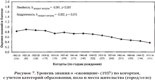 На протяжении столь длительного времени большинство когорт так или иначе могло получить кое-какие знания о периоде «ежовщины», и, как уже было сказано выше, она оказалась одним из самых известных событий в нашем опросе. В целом картина, представленная на рис. 7, такова: максимальный уровень знаний демонстрируют те, кто сам жил во время Большого террора. Далее, по мере удаления от того времени, уровень знаний для когорт постепенно спадает, причем без какого-либо заметного подъема, который должен бы соответствовать периоду гласности. Ни воспоминания старших членов семьи, ни совсем недавние откровения в прессе не смогли обеспечить младшим когортам тот же уровень знания, который имеют люди старших поколений, жившие в период «ежовщины».