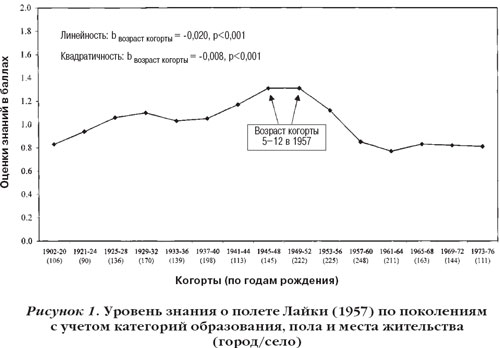 Такие события, как орбитальный полет собаки Лайки во втором ИСЗ, способствовали улучшению репутации советского режима, поэтому о них рассказывали в школах и сообщали в контролируемых государством СМИ. Знание об этих событиях имеет относительно низкую корреляцию с годами учебы в школе, потому что во время этих событий большинству россиян было еще слишком мало лет, и оно не зависит от уровня их последующего образования. Другие события, например повесть Солженицына «Один день Ивана Денисовича», длительное время замалчиваемая режимом, обнаруживают более тесную связь с уровнем образования. Люди, получившие хорошее образование, обладают критическим мышлением и могут найти несанкционированные режимом способы получения информации о том, что происходит в мире. Кроме того, такие люди в меньшей степени ограничиваются своим личным опытом, и в этом смысле образование уменьшает эффект когорты.
