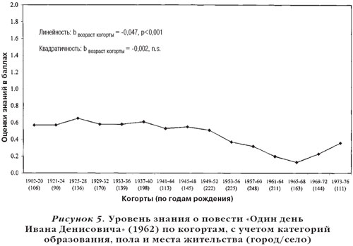 Второй процесс, обусловленный тем, что подростковый возраст и первые годы взрослой жизни — это критически важный этап приобретения знания, порождающий эффект когорты в более позднем возрасте, четче всего проявляется при анализе ответов на вопрос о повести «Один день Ивана Денисовича». В конце эпохи гласности были опубликованы произведения Солженицына, которые вызвали большой интерес, и россияне, особенно молодежь, получили соответствующее знание. Однако ни эта повесть, ни другие работы Солженицына не были прямо обращены к молодежи, поэтому, как нам кажется, в этом случае приобретение знания является следствием классического «эффекта первенства», описанного Мангеймом. Мы можем сделать следующее предположение: именно во времена радикальных перемен молодежь особенно привлекают новые идеи. В такие периоды люди старших поколений стараются сохранить прежний мир, к которому они привыкли, а те, кто слишком молод, чтобы цепляться за прошлое, открыты для свежих впечатлений и готовы быстро учиться на новых событиях.