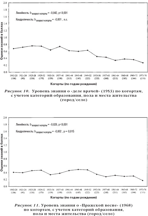 В 1953 году Сталин выдвинул против кремлевских врачей сфабрикованное обвинение в том, что они пытались уничтожить руководителей партии и армии. В то время «дело врачей» рассматривалось как зловещее начало новой волны террора, которая могла оказаться столь же масштабной (Сталин был еще жив), как террор 1936–1938 годов[17]. На рис. 10 видно, что уровень знания о «деле врачей» снижается после когорты 1949–1952 годов рождения, что трудно объяснить эффектом исторического периода, поскольку эта когорта слишком молода, чтобы даже через своих родителей осознать происходившее на общенациональном уровне. После смерти Сталина «эхо» этого мнимого за говора было, наверное, менее длительным по сравнению с докладом Хрущева на ХХ съезде, однако отметим, что общий уровень знания об этих двух событиях примерно одинаковый. Эффект исторического периода, представленный на рис. 10 посредством разделения двух уровней знания, вполне значимый (P < 0,001), причем независимо от того, как классифицируется когорта 1949–1952 годов рождения. Однако мы пока так и не можем объяснить результаты, полученные для этой когорты.