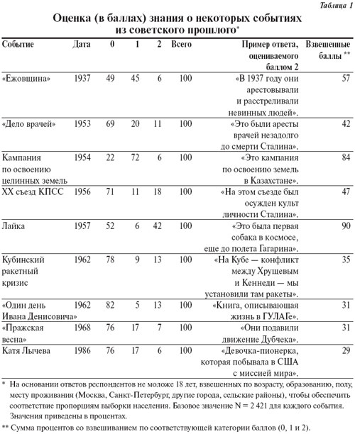 Тот факт, что двумя самыми известными событиями из нашей совокупности (см. табл. 1) являются кампания по освоению целинных земель (по ненулевым оценкам) и полет собаки Лайки в космос на втором искусственном спутнике земли в 1957 году (по взвешенным значениям оценок), указывает, что мы имеем дело не с воспоминаниями, вызванными раскрытием информации в период «гласности». Оба события произошли намного раньше, их значение в рамках советских оценок было позитивным (Лайка) или смешанным (кампания по освоению целинных земель) и в период гласности им не уделялось много внимания. Маловероятно также, что высокий уровень знания об этих девяти событиях объясняется тем, что они происходили сравнительно недавно, так как корреляция между датами и оценками в баллах совершенно противоположная (2,49 для взвешенных оценок и 2,52 для процентов ненулевых оценок, с отсутствием значимости для всех девяти событий). Возможно, ранние события казались респондентам более значимыми, чем поздние; но у нас нет способа различить, что действительно является лично важным для человека, а что обусловлено историческим периодом.