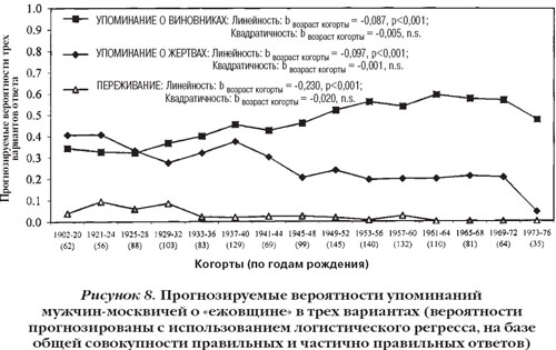 Рис. 8 демонстрирует использование коэффициентов логистической регрессии для графического представления прогнозируемых вероятностей по когортам для трех вариантов высказываний, характеризующих «ежовщину». Как и ожидалось, практически все упоминания о личном опыте относятся к самым старшим когортам, без существенного спада вплоть до когорты 1929–1932 годов включительно, детство представителей которой (от пяти до восьми лет) пришлось на са мый разгар террора. График для упоминаний о жертвах примерно такой же, с общим спадом в направлении от старших когорт к младшим, но с примечательной особенностью: подъемом для когорт 1933–1944 годов и пиком для тех, кому на момент выступления Хрущева на XX съезде КПСС было от 16 до 19 лет. Если рассмотреть этот подъем отдельно (четыре когорты, ограниченные снизу 1929 годом, а сверху 1948 годом), квадратичный член, определяющий искривление, оказывается значимым при Р < 0,02. Представляется, что подъем графика для упоминаний о жертвах частично обусловлен ответами респондентов, которые были молодыми во время Большого террора (хотя в нашей выборке нет респондентов, которые в это время были уже старыми, так что мы не можем сказать, как бы они ответили на наши вопросы), а затем — позже — респондентов, юность которых по времени совпала с выступлением Хрущева в 1956 году.