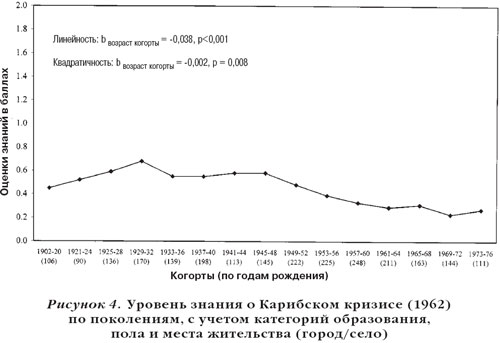 Наконец, хотя влияние поколения и возраста формально разграничить нельзя, мы предполагаем, что категория возраста играет определяющую роль в облегчении кодирования события, но после кодирования и переноса можно различать, что является эффектом когорты, а что эффектом исторического периода. Это предположение подкрепляется теоретически сформулированными прогнозами о нелинейности связей между поколениями и знанием.